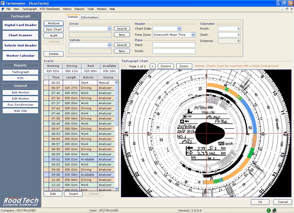 Automated Analogue Tachograph Analysis - With a scanner, which can be purchased from the supplies page, you scan in analogue tachograph charts and have them automatically analysed by Tachomaster. Digital data will be seamlessly combined so you can see Drivers' periods of drive, work, rest and availability at a glance.