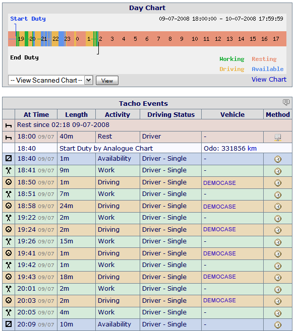 The Day View displays a breakdown of that day's work - customisable for night workers to start at whatever time of day you wish. For analogue tachographs you can also view the original scanned chart.