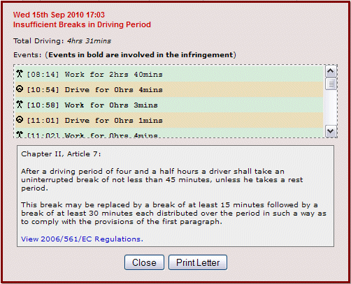 Tachograph Infringements are shown clearly and give you an explanation of why it has occured, you will be able to see all the tachograph events that caused it